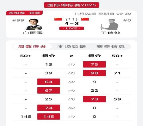 在对阵王信仲的揭幕战中,白雨露轰出单杆145高分,刷新了此前中国香港选手吴安仪保持的单杆137分,成为女子选手史上单杆最高分!目前,白雨露4-4战平王信仲,比赛因超时被暂停。