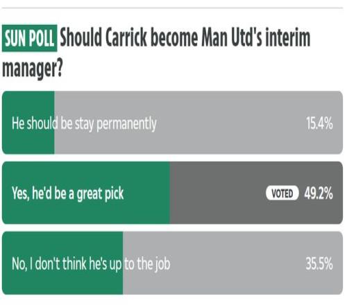 《太阳报》所做的调查显示,球迷也对卡里克谨慎看好,接近50%的参与调查者认为,卡里克是曼联临时主教练的上佳人选。