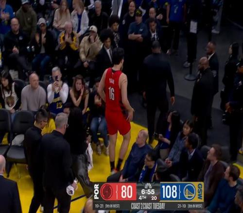 当然这场球最终也如大家所愿提前进入了垃圾时间,杨瀚森有比较长的时间可以登场。没想到杨瀚森就打了两个回合,就在一次倒地传球中后脑勺撞到了对手的膝盖,提前回到了更衣室。